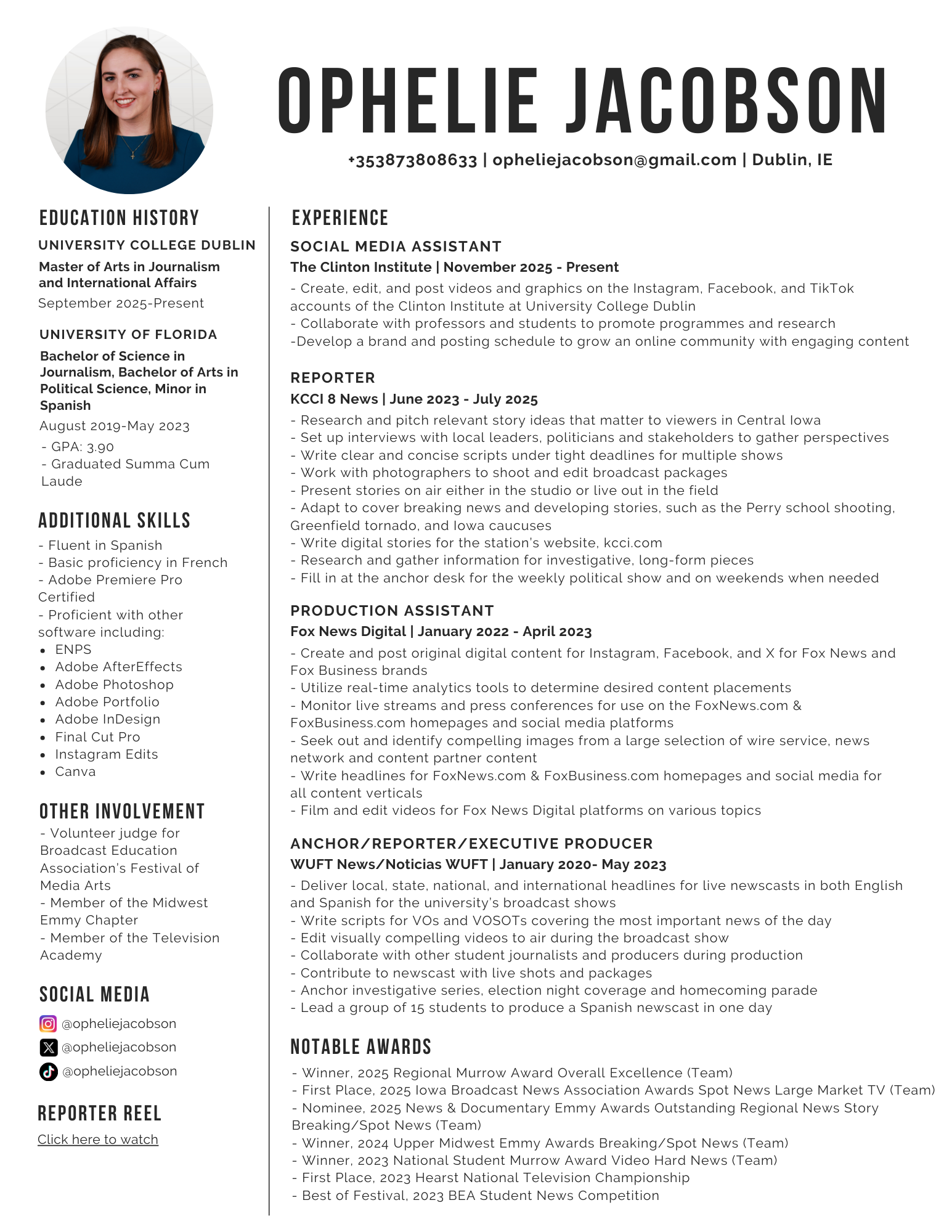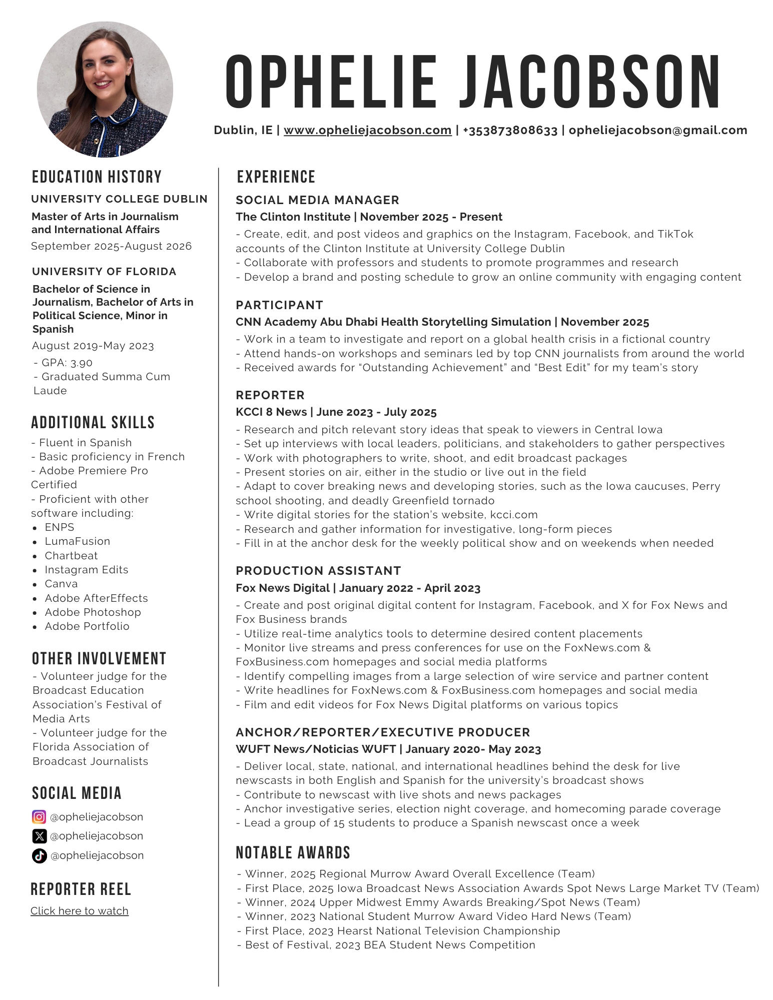 - University of Florida College of Journalism and Communications WJXT-TV Award for Broadcast Journalism 2023